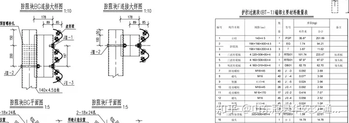 以三波形護(hù)欄BT端頭圖紙為例,我們可以看到其結(jié)構(gòu)特點(diǎn)包括:梁板采用波浪形設(shè)計(jì),以增強(qiáng)其抗沖擊能力;端部翼墻采用特殊形狀,以實(shí)現(xiàn)與混凝土護(hù)欄的平滑過(guò)渡;此外,還需考慮梁板與路肩或中央分隔帶的連接方式,以確保整個(gè)護(hù)欄系統(tǒng)的穩(wěn)定性和可靠性。