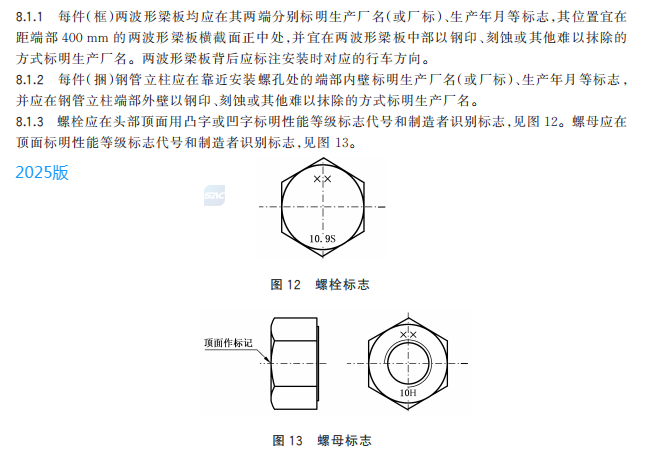 z) 更改了鋼管立柱、兩波形梁板、螺栓和螺母的標(biāo)志方法(見(jiàn) 8.1.2、8.1.3,2015 年版的 7.2、7.3)。